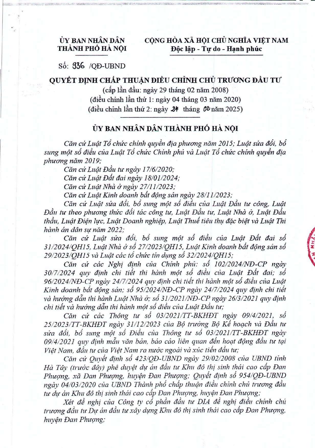 2025-0224G-936-UBNDHN. Quyết định chấp thuận điều chỉnh chủ trương đầu tư (thay đổi lần 2)